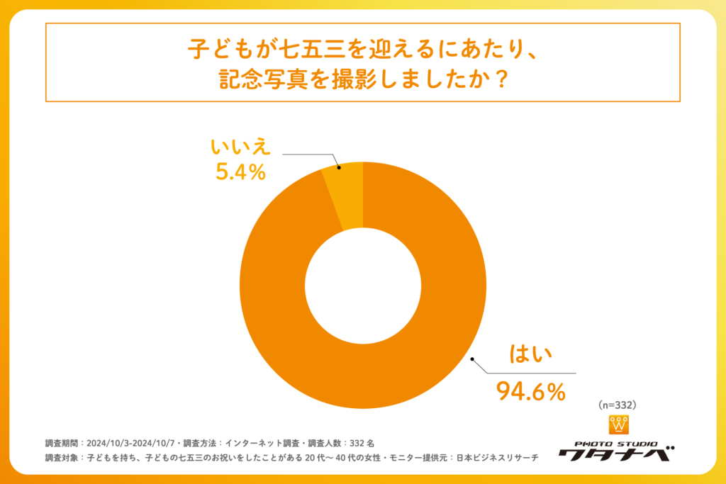 「子どもが七五三を迎えるにあたり、記念写真を撮影したか」を尋ねる設問への回答では「はい」が94.6%となりました。この結果から、ほとんどの家庭で七五三のお祝いで記念写真を撮影していることがわかりました。