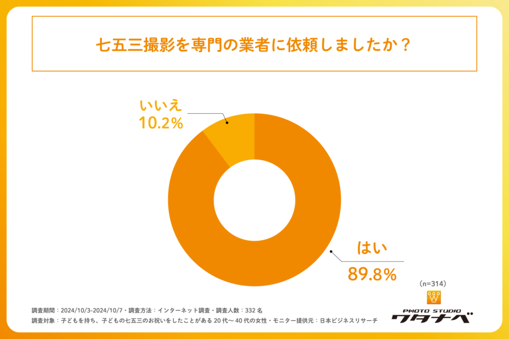 次に「子どもが七五三を迎えるにあたり、記念写真を撮影した」と回答された方に「七五三撮影を専門の業者に依頼したか」を尋ねる設問では「はい」が89.8%となりました。この結果から、先ほどの設問に続き、ほとんどの家庭が子どもの七五三の記念撮影は専門の業者に依頼している、という実態が明らかになりました。