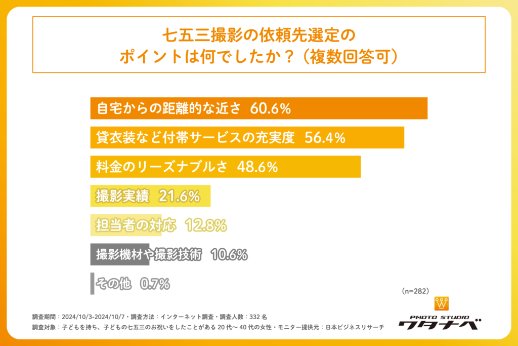 【調査結果⑤】七五三撮影の依頼先選定の主なポイントは「自宅からの近さ」「付帯サービスの充実度」「料金のリーズナブルさ」